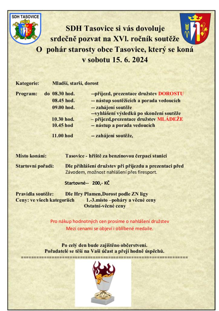 SDH Tasovice si vás dovoluje srdečně pozvat na XVI. ročník soutěže O pohár starosty obce Tasovice.